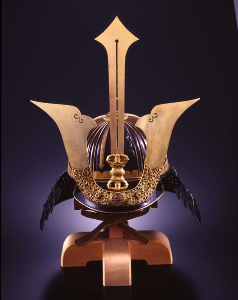 A helmet worn by Mogami Yoshiaki, said to have been a gift from Oda Nobunaga. The helmet bowl is an elegant example of craftsmanship from the early Muromachi period, while features including the shikoro (neckguard) and mabisashi (helmet visor) were reformed during Yoshiakifs lifetime, when the gsparrows and bambooh Mogami family crest was also added to the stylized helmet decoration. Worn by Yoshiaki during the Battle of Hasedō in 1600, the helmet was struck by an enemy bullet, but protected Yoshiaki from harm. A testament to the fierceness of the fighting, the helmet still bears the marks of this bullet. Weight, 3.1 kg.