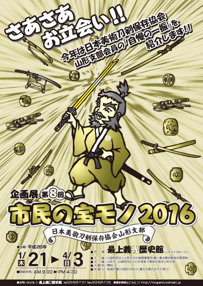今年は、日本美術刀剣保存協会山形支部とコラボして、会員の方々が愛蔵する自慢の日本刀12振りを展示紹介します。