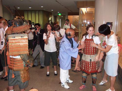 また、見学の最後には、ホンモノのヨロイを着用し、青い目のサムライたちは「重い!!」「サムライは大変だ!!」などと感想を述べていました。