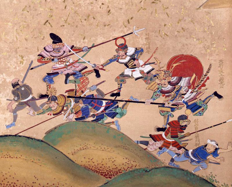 ▲左隻:退却する上杉軍と追撃する最上軍が描かれています。中央には、有名な鉄の指揮棒をふるって猛追する大将最上義光、左手には、鉄砲隊に守られた寄せ手の大将直江山城守が描かれています。(※クリックすると拡大します)