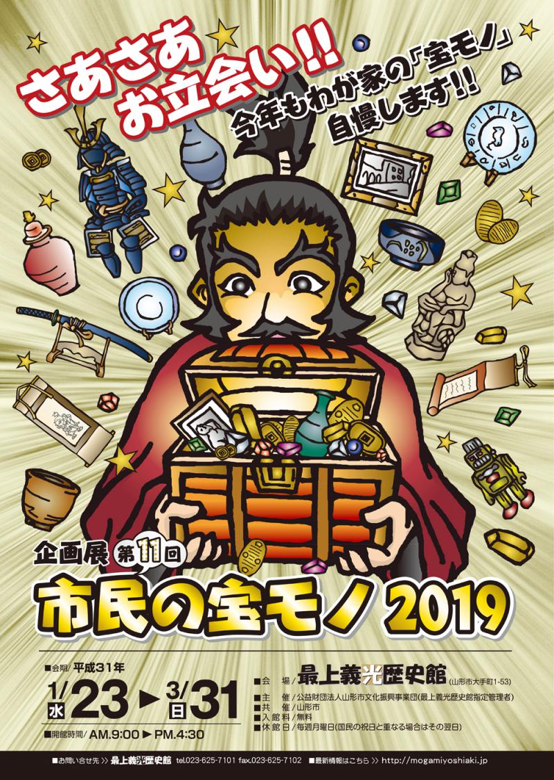 この展覧会は、山形市民を対象に、所蔵する「宝モノ」を募集して、最上義光歴史館の展示室に展示し、広く一般に公開する市民参加型の展覧会です。出品に関しては自薦他薦を問わず、また、洋の東西・時代・評価額・文化財としての価値なども一切問いません。自慢の「宝モノ」を募集し紹介するものです。