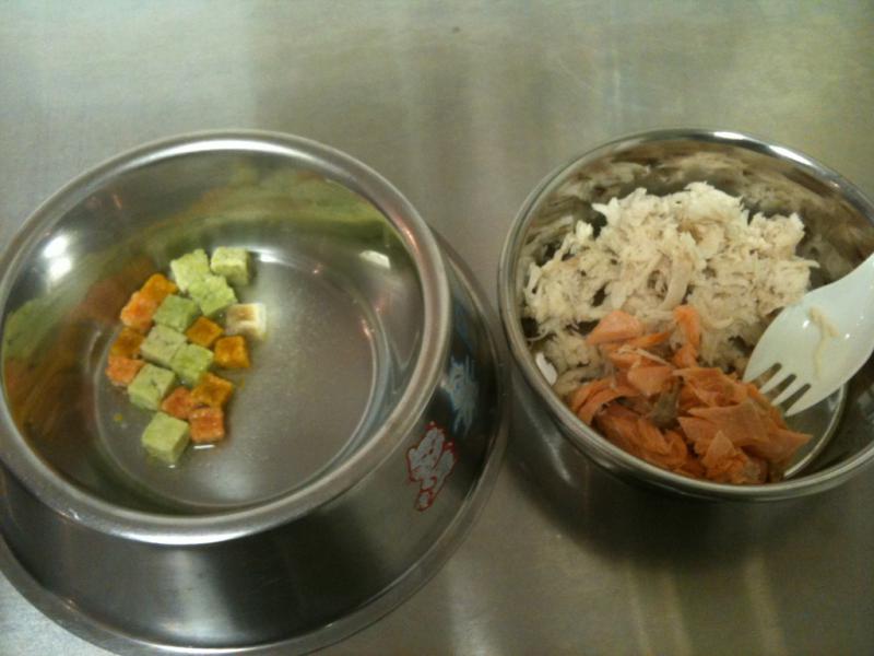 今日は、鳥ササミとサーモンです。体重が4・5kなので普通のフードであれば、50gかな?