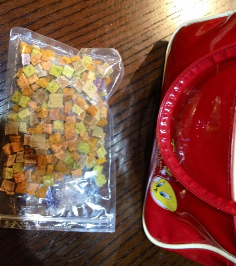 塗り薬、ペットシーツ、体を拭くウエットシート、携帯用の水のみ、あまり使いませんが紙オムツ、ウンチバッグ、そして大好きな、わんこのサラダのミックスです。もちろん食べ放題です。最近は、ランチョンマットも持ち歩いています。なんでか、昨日は柔道着も持っていました。