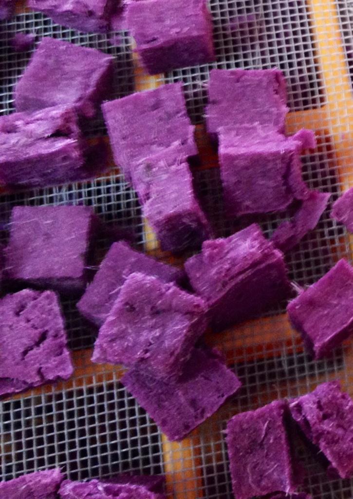 人気の紫芋のフードを作っています。昨日から作っている紫芋のフードが完成しました。今日、来て頂いたお客様に味見して頂いています。甘くてあんこの様です。