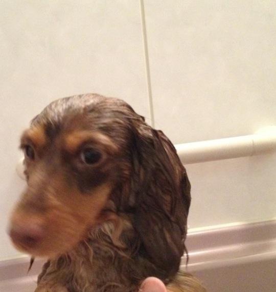 いつものザンバラヘァーもお湯に浸かるとぺっしょり、シシャモみたいな顔です。