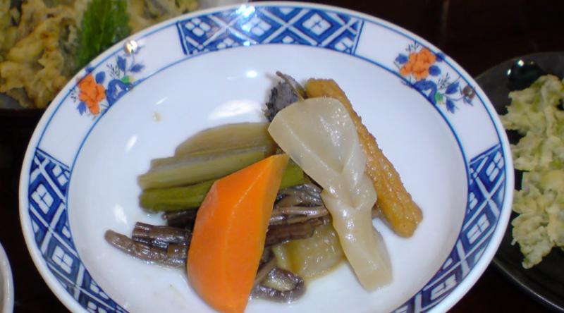 「干しぜんまい」を戻したものをメインに、季節の「山うど」「ふき」などに季節のきのこも入れて「がんもどき」がこの料理の味を引き立てます。