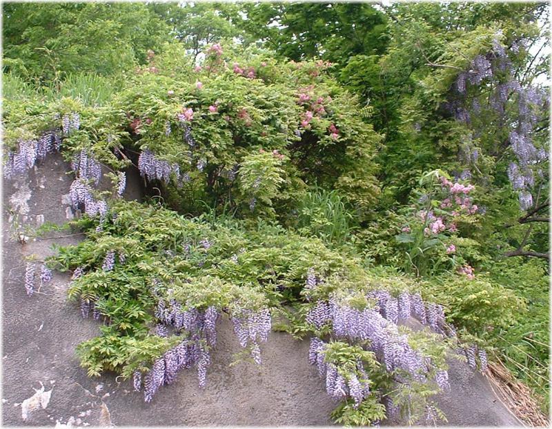 昨年、交通安全のノボリ旗が目印、白滝不動尊のお堂の上に咲いたものです。