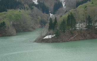 間欠泉の下流白川ダム湖畔はぶな林の芽吹きです。