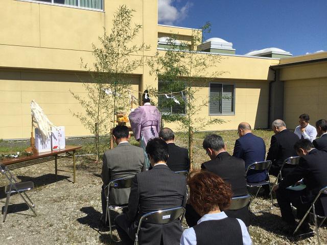 来年3月に南陽市にある当法人事業所「障がい者支援施設南陽の里」敷地内にて、児童発達支援事業所と放課後等デイサービス事業所の併設施設「多機能事業所なんよう(仮称)」を開所することとなり、先日工事着工に先駆け地鎮祭を執り行いました。天気にも恵まれ、これから約4ヶ月間での完成を予定しており、工事の安全等を祈願して頂きました。