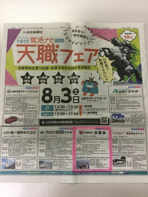 8月3日(土)に山形テルサで行われる天職フェアに、友愛会も参加させていただきます。就職・転職をお考えの方向けの合同企業説明会となっております。