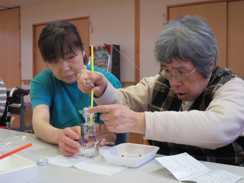 職員と一緒に、皆さん思い思いに真剣な表情で作っていらっしゃいました。