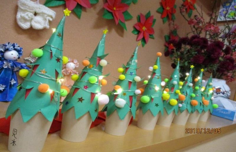 デイサービスセンターくろさわでは、クリスマスツリーを飾り、創作レクリエーションでは、利用者の皆様と一緒に持ち帰りのミニクリスマスツリーを作り、クリスマスの雰囲気を楽しみました
