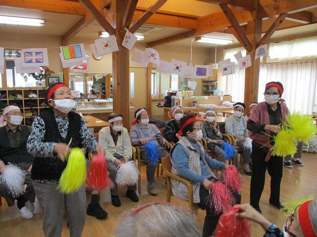 皆さんコロナウィルス感染予防対策を行い、元気よく応援合戦、玉入れ、じゃんけんリレーをされました。接戦になり歓声と応援の声が飛び交い、大盛り上がりの運動会になりました。今年は外出行事の機会も少なく、ご利用者の皆様のストレス発散の良い機会になったようです