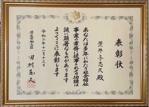 令和2年度社会福祉功労者に対する厚生労働大臣表彰の被表彰者が決定し、当法人では「障がい者支援施設すげさわの丘」荒井与志久施設長(当法人理事長)が受賞いたしました。この表彰は、多年にわたり地域福祉の推進に尽力し、その功績が特に顕著であると認められる者に対して、厚生労働大臣が行うものです。
