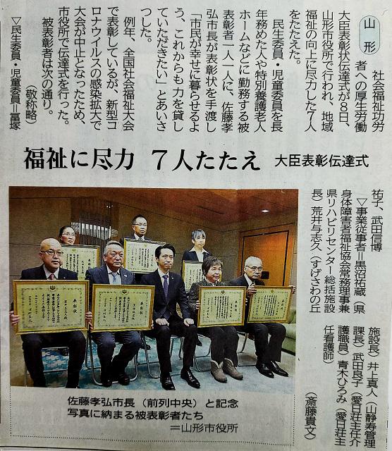 令和3年1月10日の山形新聞に社会福祉功労者への厚生労働大臣表彰状伝達式の記事が掲載されました。当法人からは「障がい者支援施設すげさわの丘」施設長荒井与志久(当法人理事長)が受賞者として出席いたしました。(写真:前列一番左)