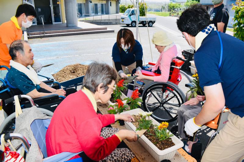 毎年恒例のいちょうの家さんの花苗植栽が行われました。3密を避けるため、8人ずつ分かれて、自分の好きな花を選びプランターに植えました。なかなか外にも出られなかったという事もあり、利用者の皆さんは久しぶりの青空の下、笑顔いっぱいの植栽となりました。その後も利用者の皆さんと水かけを頑張ってしており、綺麗な花が咲いています。