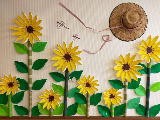 みはらしの丘の廊下に大きな手作りのヒマワリが咲きました。よくみると、かたつむりとテントウ虫が!